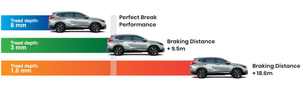 - Change tyres at 3 mm – 1.6 mm (minimum legal tread depth).