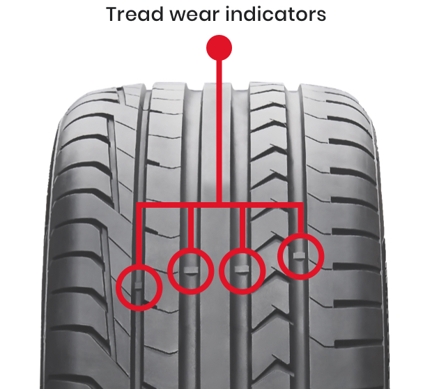 - Molded bars in the grooves of the tyre to show the tread depth.